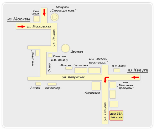 Адрес: Россия, Калужская область, г. Малоярославец, ул. Герцена, д. 39А Схема проезда: