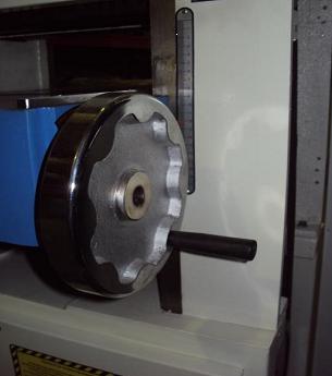 Подъем/опускание рабочего стола при помощи маховика. Отображение размера на линейке.
