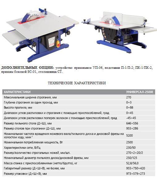УНИВЕРСАЛ-2500Е предназначен для обработки древесины (фанеры, древесно-стружечных плит и т. п.) пилением, фугованием, фрезерованием, сверлением с ручной подачей заготовки.
