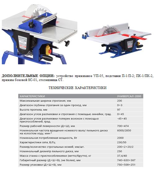 УНИВЕРСАЛ-2000 – легкий и компактный бытовой многофункциональный деревообрабатывающий станок, предназначенный для обработки древесины (фанеры, древесно-стружечных плит и т. п.) пилением и фугованием с ручной подачей заготовки.