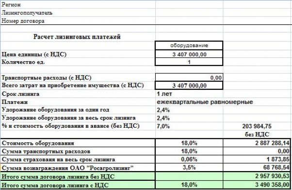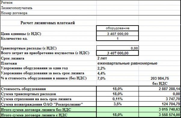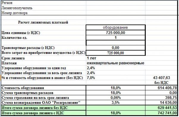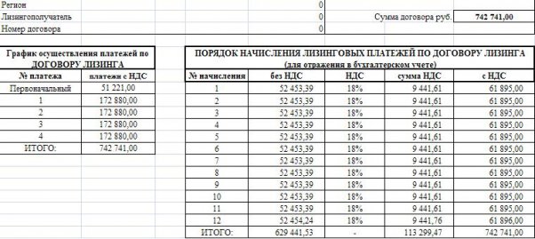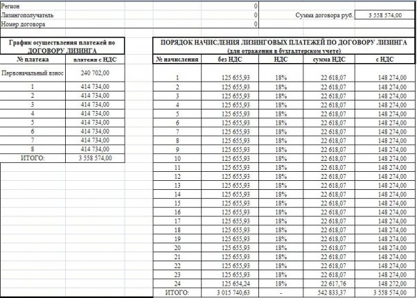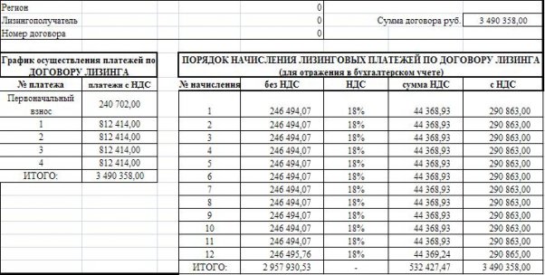 1. Период действия договора лизинга - как правило, 24-36 месяцев 2. Предоплата (авансовый платеж) - 25%-30% от стоимости предмета лизинга 3. Оплата лизинговых платежей равными долями ежемесячно.